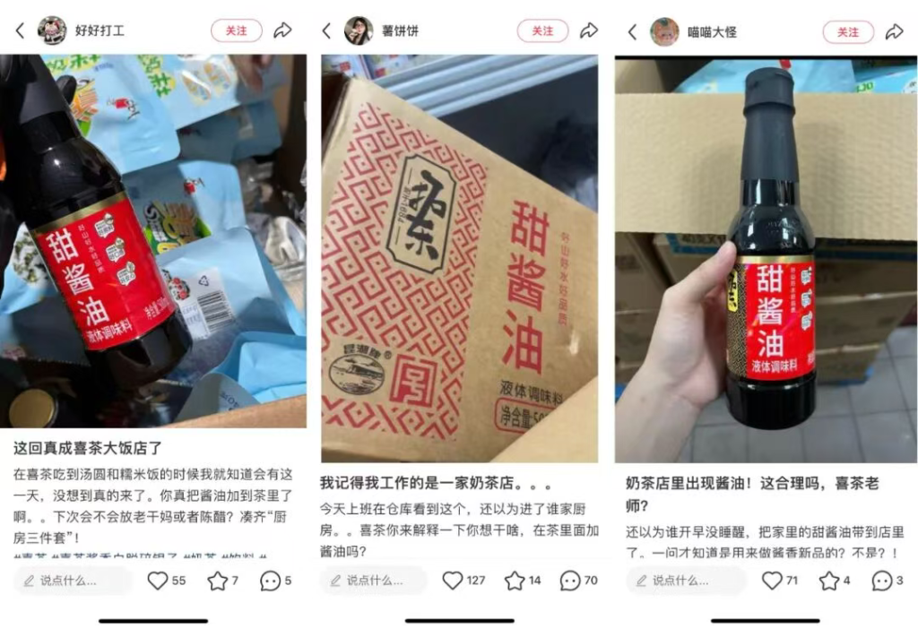 连日来,在社交媒体上不少喜茶员工晒出了茶饮门店里的“稀客”——酱油。