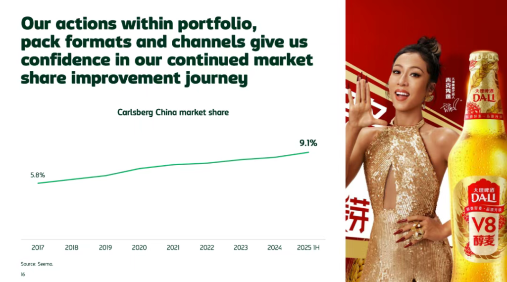 截至目前,嘉士伯已在中国发展30年,运营着27家啤酒厂。根据李志刚在会上披露的数据,嘉士伯中国市场份额从2017年的约6%增至2025年上半年的9%。“虽然不算特别低,不过竞争对手的份额多在20%到30%之间,我们仍有很大的提升空间。”李志刚说。