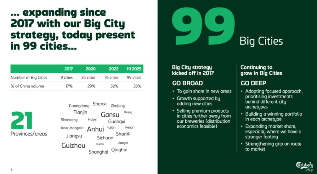 “大城市是我们的核心优势领域之一。”他说,嘉士伯在中国的增长很大程度上依托于大城市市场,2017年嘉士伯在中国仅覆盖少数几个大城市,如今已扩展到99个,这些大城市的销量已占其总销量的三分之一,为整体增长做出贡献。