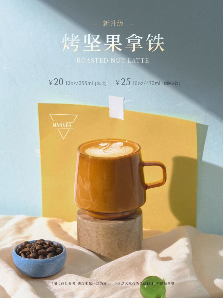 今日,MANNER宣布烤坚果拿铁在全国门店升级回归,该产品据称有着烤杏仁与核桃的浓郁香气。(公司发布)