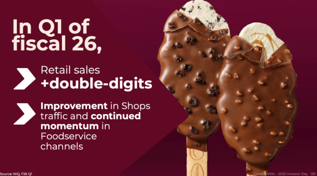 在2025财年,哈根达斯在国际市场实现了中个位数的增长,但在中国的门店业绩承压。尽管如此,在2026财年第一季度(截至2025年8月24日的一个季度),哈根达斯零售业务实现双位数增长,门店客流量也有所改善。