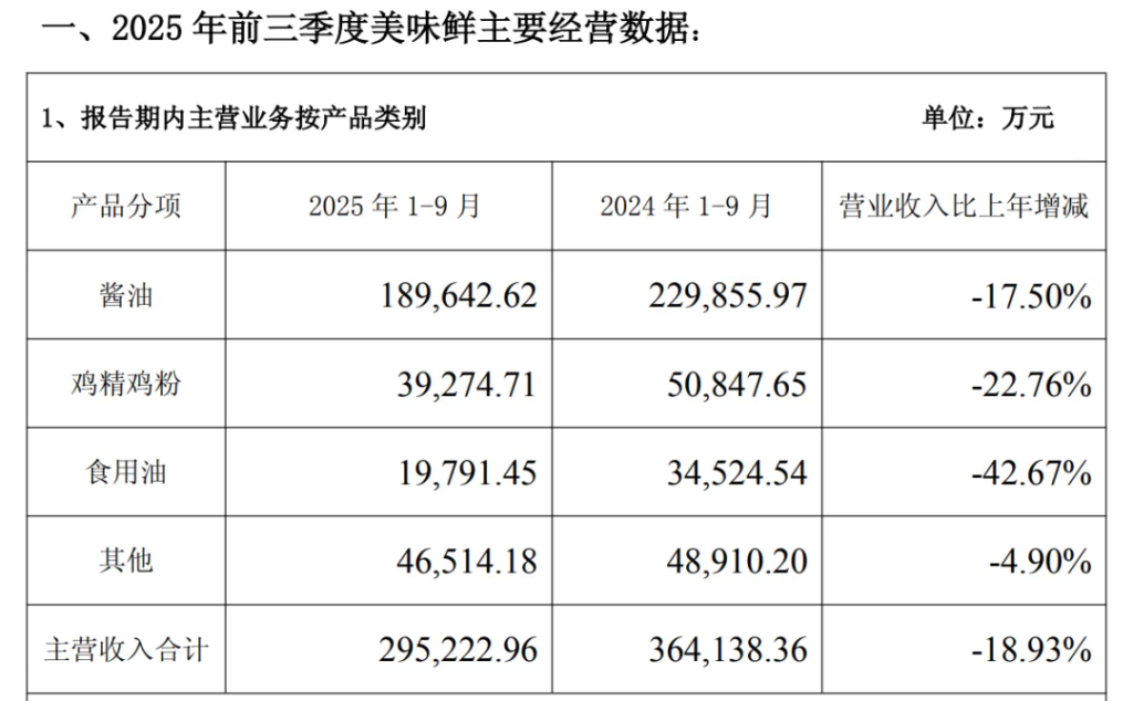 今天,中炬高新公告,第三季度实现营业收入10.25亿元,同比下降22.84%;归属于上市公司股东的净利润1.23亿元,同比下降45.66%。前三季度实现营业收入31.56亿元,同比下降20.01%;归属于上市公司股东的净利润3.8亿元,同比下降34.07%。其中,美味鲜公司1-9月实现营业收入31.07亿元,同比减少7.01亿元,减幅18.40%,主要是公司坚持推动经销商库存优化及夯实市场基础体系,调味品销售下降影响;归属母公司净利润3.67亿元,同比减少1.90亿元,减幅34.14%,主要是调味品销售收入同比下降及销售费用、管理费用、财务费用同比上升共同影响。(公司公告)