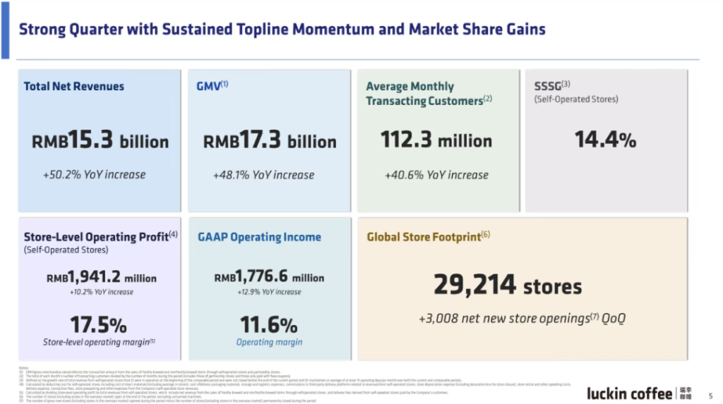 根据这家在国内拥有最多门店的咖啡连锁公布2025年第三季度财报,期内,其实现总净收入为152.871亿(人民币,下同),同比增长 50.2%;GAAP营业利润为17.77亿元,同比增长12.9%; 自营门店同店销售额增长14.4%,较2024年同期下降13.1%的情况显著改善;净新开门店数为3008家,门店总数达29214家。