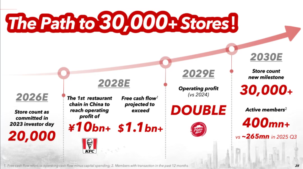 该公司发布的最新目标显示,预计门店数到2026年达20000家、2028年超25000家、2030年超过30000家。尽管今天并未披露3万家门店的详情,但可以肯定的是,肯德基和必胜客依然是撑起大盘的两个品牌。