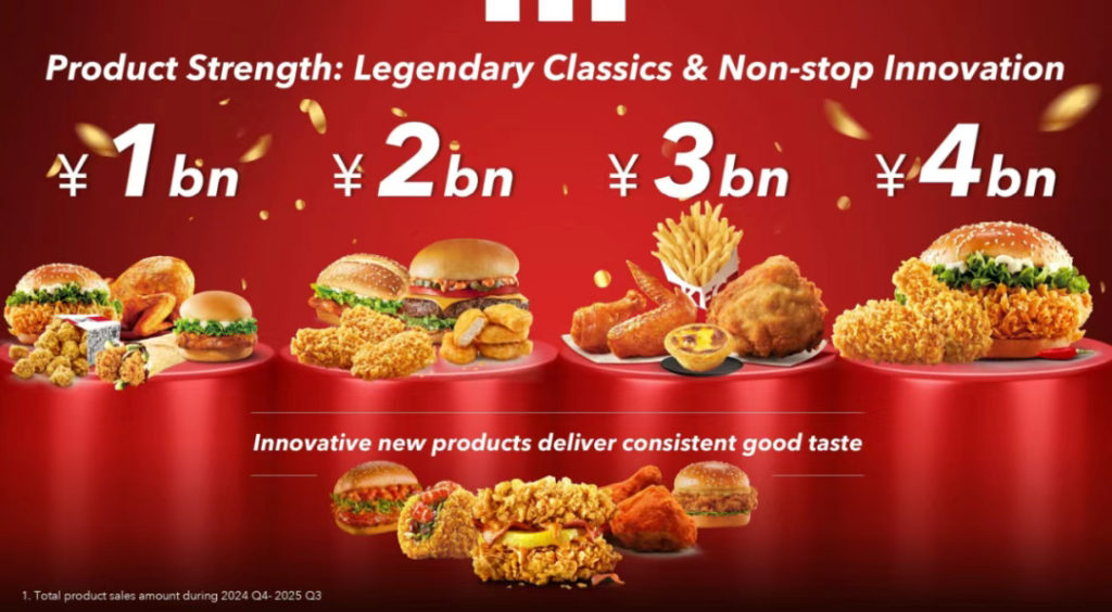 以产品力为例,品牌将通过延展性创新、供应链优化来提升大单品销售额。今年,肯德基前六大单品的年度销售额预计可超220亿元,贡献品牌30%销售额。其中,香辣鸡翅和香辣鸡腿堡的年度单品销售额均已超过40亿元,“意味着一款产品已经跑赢中国A股市场70%上市公司的年度销售额”。