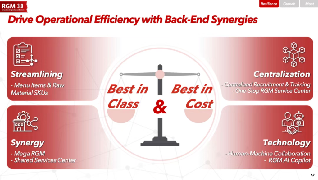 “我们的最终目标是在同类产品中做到最好品质、最优成本。”屈翠容指出,这由四大关键支柱支撑:精简菜单,提升运营效率;集中化处理关键流程,解放餐厅经理;人才协同,推行Mega RGM项目,让表现优异者能从管理1家门店转为管理2-4家门店;引入自动化与AI解决方案赋能员工。