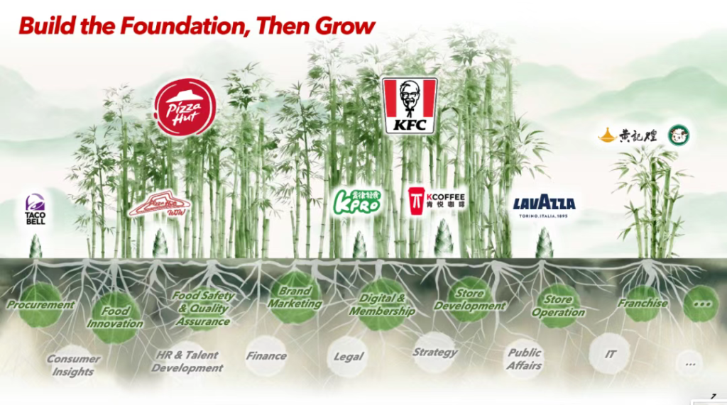 “如今,我们的根基不仅滋养着肯德基和必胜客,也孕育着新兴业务的成长。”她说,“这就是我们从竹子身上学到的:要有耐心,要投资于基础建设,并坚信有了坚实基础,我们就能复制成功,并在未来几年加速发展。”