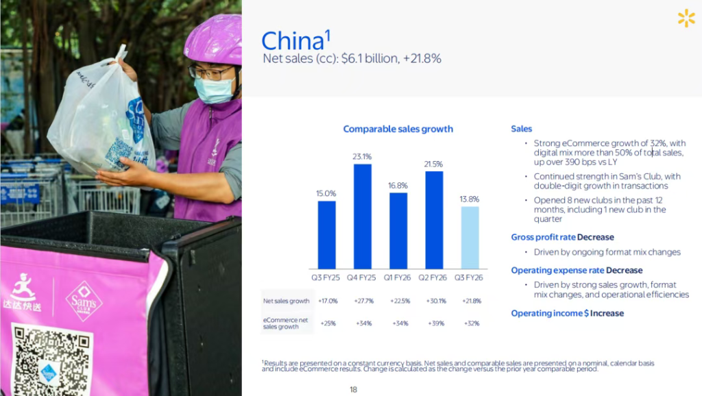 “第三季度,我们在中国的销售额增长了22%,这反映了山姆在华持续强劲表现以及电商超过30%的增长。”沃尔玛首席财务官John David Rainey表示。