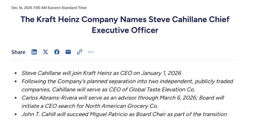 今天晚间,这家跨国食品巨头宣布,已任命Steve Cahillane为公司首席执行官,自2026年1月1日起生效。Cahillane还将加入公司董事会,并在卡夫亨氏分拆为两家独立上市公司后,担任“全球风味提升公司”(Global Taste Elevation Co.)的首席执行官。