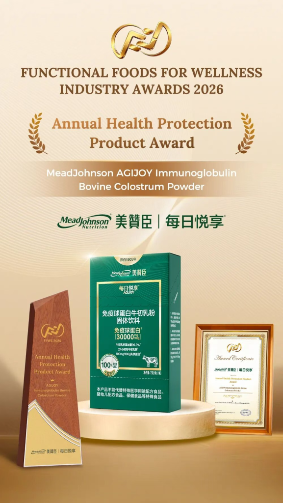 在成人营养赛道,美赞臣旗下“每日悦享”品牌同样表现亮眼。其明星产品免疫球蛋白牛初乳粉固体饮料在2026年亚太功能食品健康峰会(FFWS 2026)中获“年度保护力健康大奖”,备受行业认可。该产品依托美赞臣百年科研积淀,以精准配方满足中老年群体健康需求。