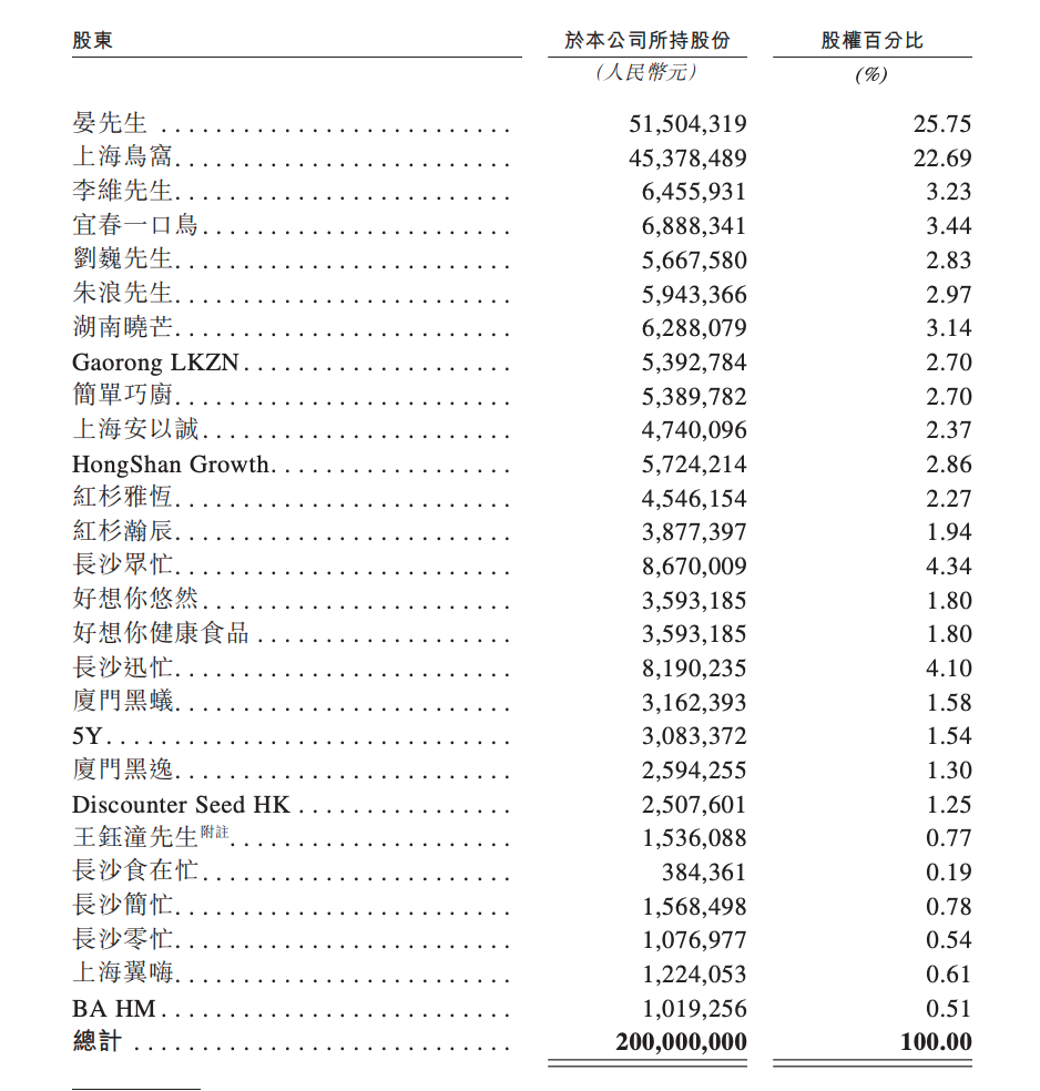 IPO前,晏周是鸣鸣很忙的最大股东,他也是公司董事长、执行董事兼总经理,持股25.75%。上海鸟窝为第二大股东,持股22.69%,上海鸟窝实际控制人是赵定,他也是鸣鸣很忙副董事长、执行董事兼副总经理。