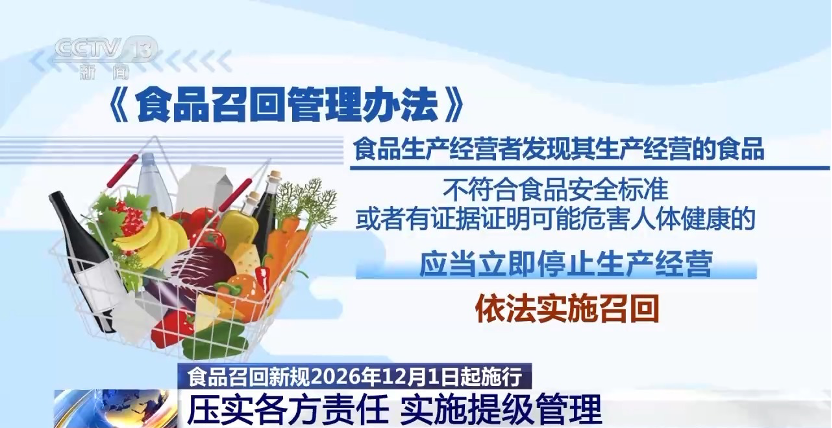 食品召回新规12月1日起施行记者昨日从市场监管总局获悉,新修订的《食品召回管理办法》将于2026年12月1日起施行。新版《办法》进一步压实食品生产经营者主体责任,明确发现食品不符合安全标准或可能危害健康的,应立即停止生产经营并依法召回;网络食品交易第三方平台应配合停止销售并督促发布召回公告。《办法》完善召回分级,明确三级召回情形,并缩短启动时限:一级24小时、二级36小时、三级48小时。同时,强化技术支撑和专家保障,加大对拒不召回或不配合召回行为的处罚力度。食品生产经营者实施召回,不免除其依法应承担的其他法律责任。(央视新闻客户端)