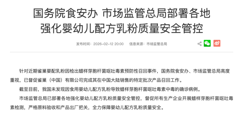 两部门:部署各地强化婴幼儿配方乳粉质量安全管控
