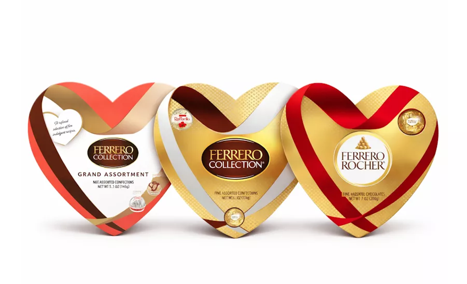 今年情人节,费列罗巧克力在海外市场推出了品牌标志性的心形礼盒。礼盒提供三种不同款式。(snackandbakery)