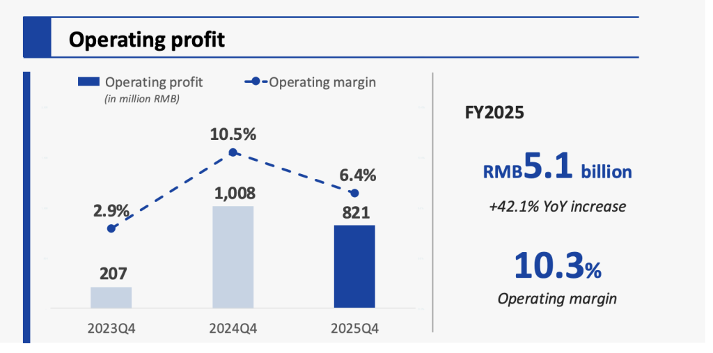 在去年第四季度,瑞幸总净收入为127.77亿元,同比增长32.9%;GAAP营业利润为8.21亿元,同比下滑22.8%;GAAP营业利润率为6.4%,低于2024年同期的10.5%。