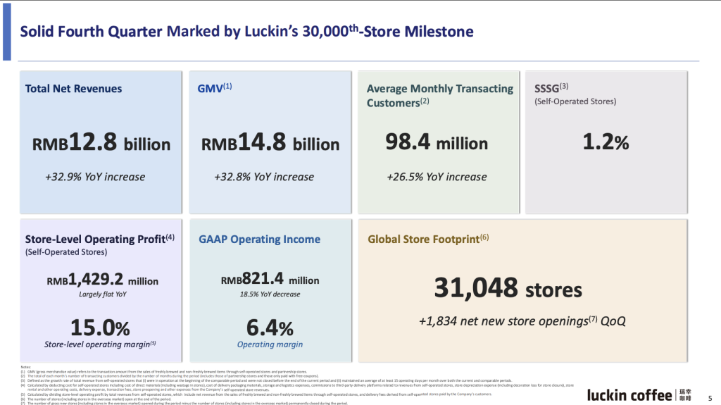 “四季度的同店和利润表现是受到了季节性,包括外卖平台补贴策略的变化,以及整个杯量结构(注:指外卖订单的占比)等一系列综合因素影响。但是,这一情况也基本符合我们整体预判。”郭谨一说。