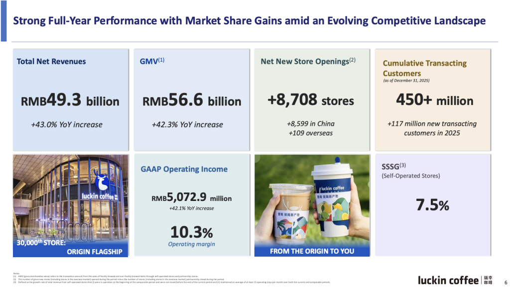 “2025年是瑞幸咖啡夯实长期发展基础、继续取得高速成长的关键一年。面对中国咖啡市场加速释放的发展潜力,我们始终保持高度聚焦、灵活调整运营策略,围绕门店覆盖、客户增长和产品创新等关键指标,持续推进聚焦规模增长的核心战略,不断扩大供需两端的优势,市场份额持续稳步提升。”瑞幸咖啡联合创始人、首席执行官郭谨一在今晚召开的业绩说明会上说。
