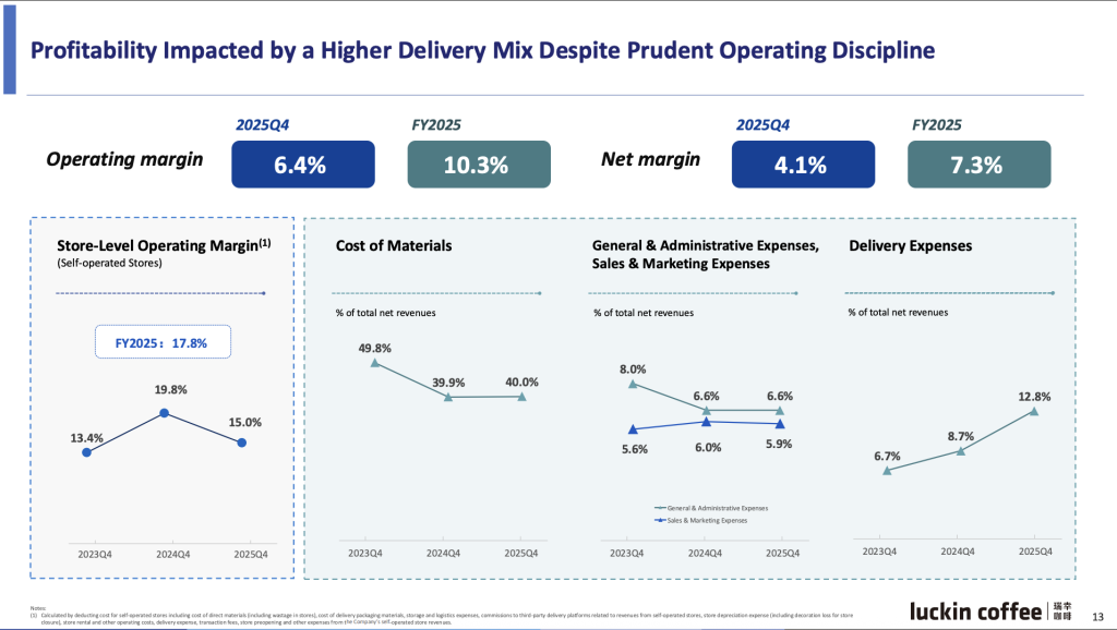 其中,瑞幸自营门店全年的收入为362.43亿元,同比增长41.6%;同店销售增长率为7.5%,较2024年的-16.7%显著改善;门店层面营业利润率为17.8%,较2024年的19.0%有所下滑;门店层面营业利润为64.36亿元人民币,同比增长32.2%。联营门店全年收入115.94亿元,同比增长49.7%。