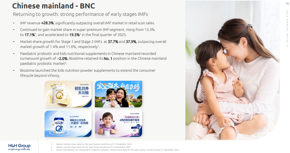 财报显示,去年,健合BNC营收达52.6亿元,同比增长20%。其中,合生元中国内地婴幼儿配方奶粉销售额同比增长28.3%。在内地,合生元在超高端婴幼儿配方奶粉市场份额达17.1%⁴,创历史新高,并在2025年最后一季跃升至19.5%⁵。