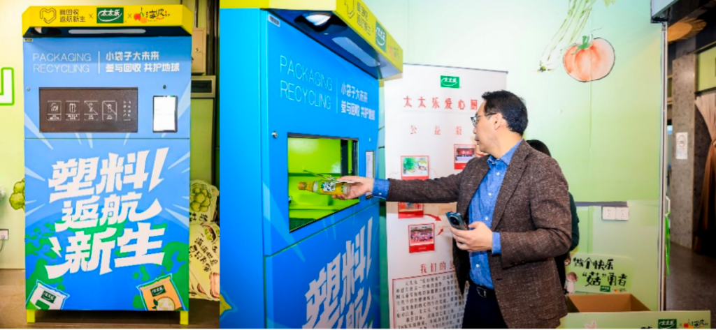 在包装设计上,太太乐坚持3R1D原则,通过取消纸箱覆膜、改深色包装为浅色包装、使用可回收再生设计的镀铝袋替代传统铝箔复合袋、推进包装减量化、使用再生塑料打包带等一系列举措,大幅提升了包装的环保性能和可回收比例。而在消费端,通过与爱回收合作“塑料返航新生”等行动,将可持续项目下沉至社区,构建起从生产到消费的绿色闭环。