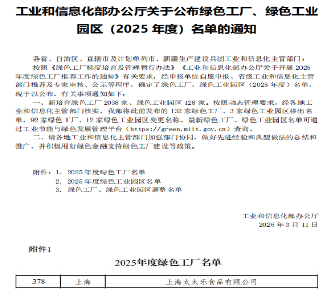 最近,太太乐获评国家级“绿色工厂”。这一称号背后,是太太乐稳扎稳打的绿色升级路径,也是其体系化实力的又一力证——太太乐此次申报依据的新版《绿色工厂评价通则》(GB/T 36132-2025)评价指标体系,围绕能源低碳化、资源高效化、生产洁净化、产品绿色化和用地集约化5个方面14项评价指标进行考评,充分展示了对太太乐在节能降碳方面的实践成效,和以高标准引领绿色工厂高质量建设的认可。