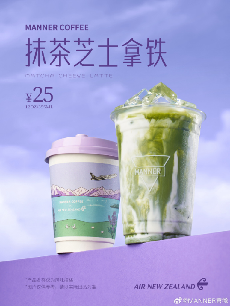 据MANNER昨日官微,其将携手新西兰航空开展联名活动,并在全国范围内上线联名饮品“抹茶芝士拿铁”。今日起,购买“新西兰航空小包套餐”即可获赠“新西兰航空联名小包”一个。此外,上海还有两家沉浸式联名主题门店限时启航。(公司发布)