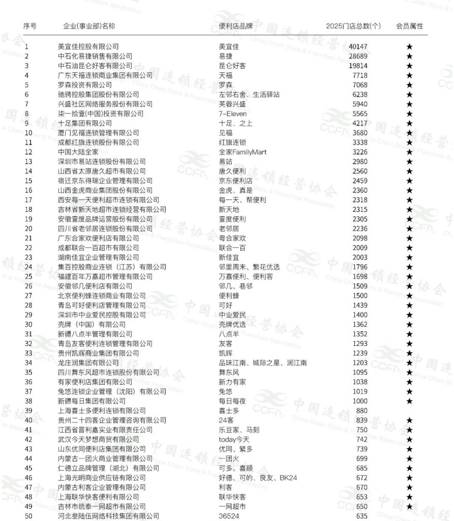 根据中国连锁经营协会(CCFA)开展的2025年中国便利店行业基本情况调查结果,按照便利店企业截至2025年12月31日的门店总数量统计汇总,发布“2026年中国便利店Top100”。2025年,便利店Top100企业门店数合计20.8万家,比上年净增约1.1万家,增幅为5.6%,增幅较上一年有所下降。门店数最多的10家企业中,新增厦门见福,其他9家与上年相同。门店数达到千家以上规模的企业有38家,与2024年持平。本年度,宿迁京东得瑞、重庆渝合家、河北咱家、沈阳森笛、十分便利新进入名单,原上海好德可的便利和良友金伴便利整合后以上海光明商业供应链有限公司名义进入名单。(中国连锁经营协会官微)